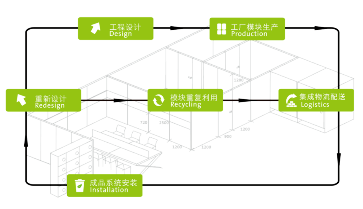 汉尔姆以“工业设计+精密制造+智能建造+数字管理”的总体思路,全面贯通BIM、MES、ERP等信息化、数智化管理系统,通过赋予部品部件专属二维码,串联起研发、设计、制造、物流、建造、运维,到快速拆装、循环再利用的全过程。当未来空间面临改造、内装更新、设备扩容、管线改造等需求,可通过专属二维码等手段识别、追溯,可单模块拆改,提升日常检修的便利性,部品部件循环利用率达到95%-98%,极大降低运营维护费用,构建绿色低碳建筑循环经济产业链,实现建筑全生命周期精确管理,将建筑生命周期的从“摇篮到坟墓”,提升为从“摇篮回摇篮”的转变。