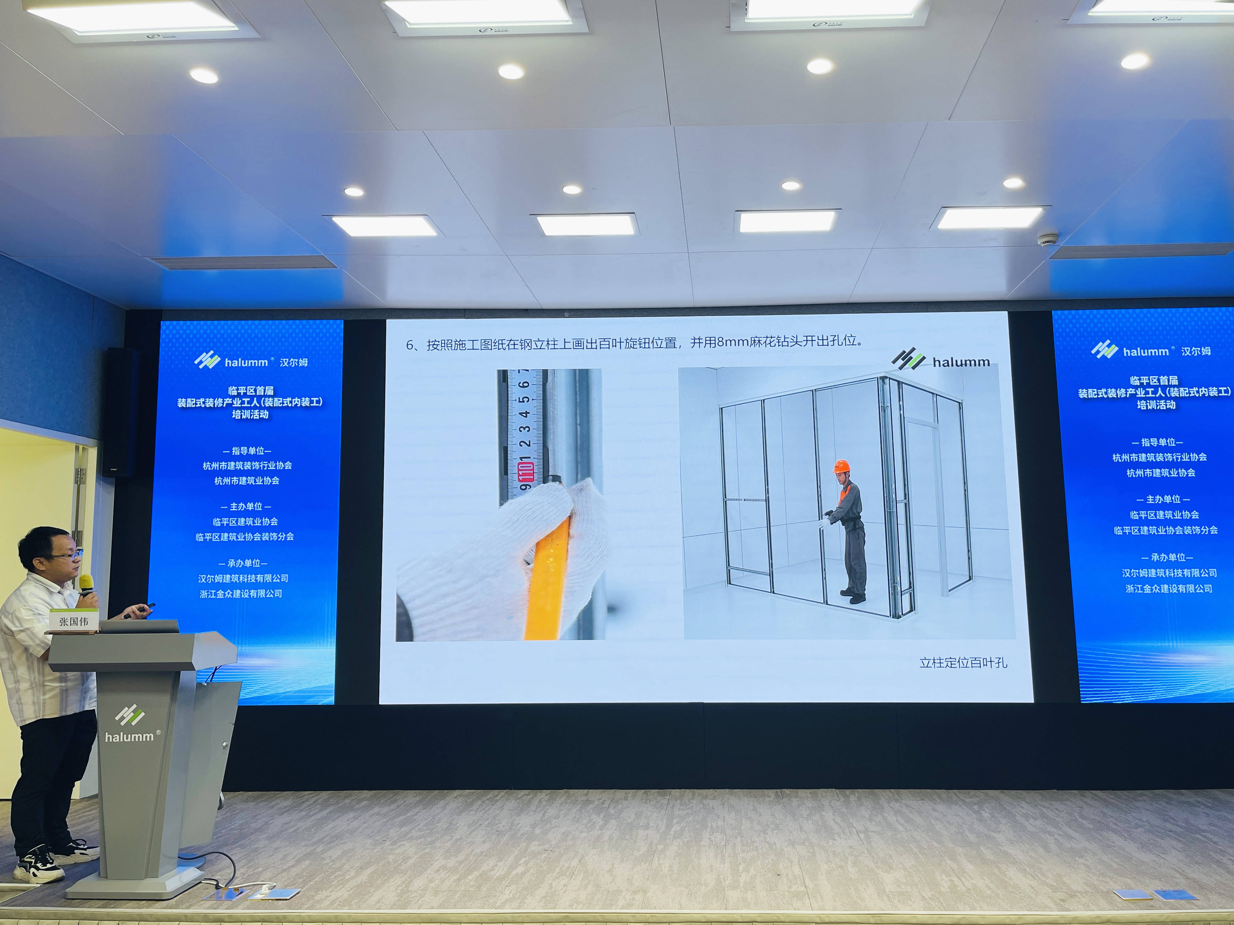 随后,汉尔姆装配式设计研究院工艺所副所长俞凤成、汉尔姆建筑科技有限公司产品安装经理张国伟进行了装配式隔断安装、装配式卫生间安装的理论知识讲解,涵盖施工准备、材料性能、关键操作规范及验收标准等内容。