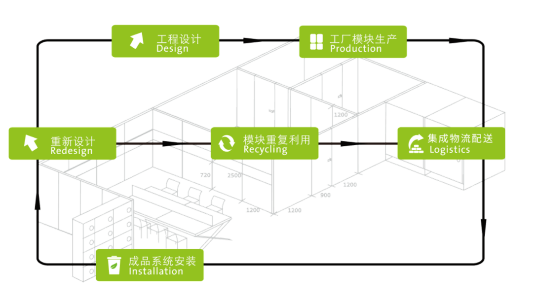 其次研发了专用智能化生产流水线,采用智能制造的方式提高加工精度,实施管理上采用信息化和数字化技术,贯通设计、采购、生产、施工、运维全生命周期各环节,形成材料的循环利用闭环,并通过专属二维码等手段识别、追溯部品部件,实现可持续设计和可循环利用。